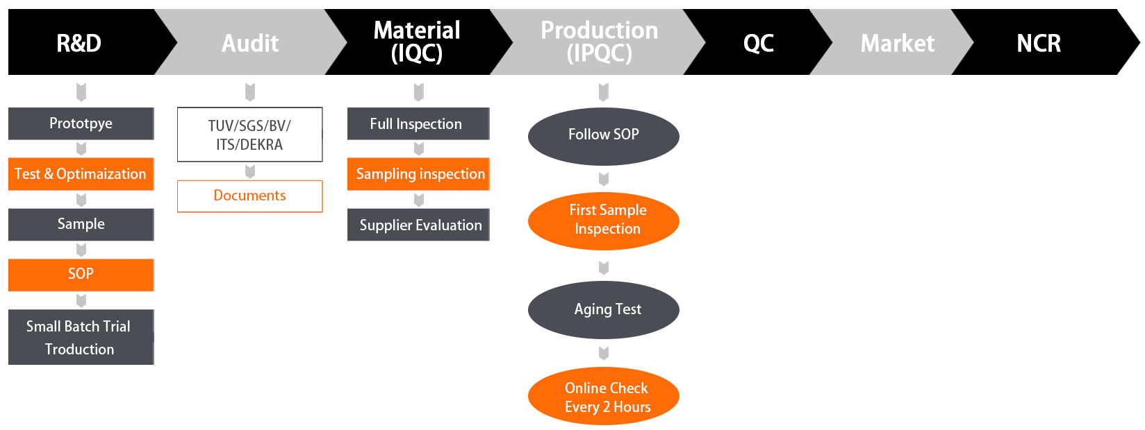 A pesar de los rigurosos controles, aún puede ocurrir una pequeña cantidad de informes de no conformidad. Los NCR proporcionados por el cliente son apreciados y utilizados para mejorar y optimizar continuamente los procesos. Al recibir comentarios de los clientes, los estándares y puntos de control se sincronizan con el sistema de gestión de producción. La producción sigue los procedimientos operativos estándar, las auditorías y el IPQC realizan inspecciones basadas en puntos de control, y los productos terminados se inspeccionan de acuerdo con los estándares del cliente antes de ser incluidos en el inventario.